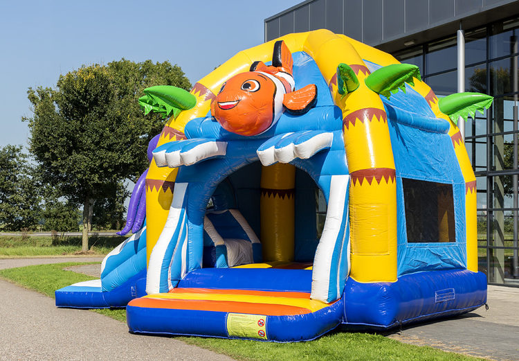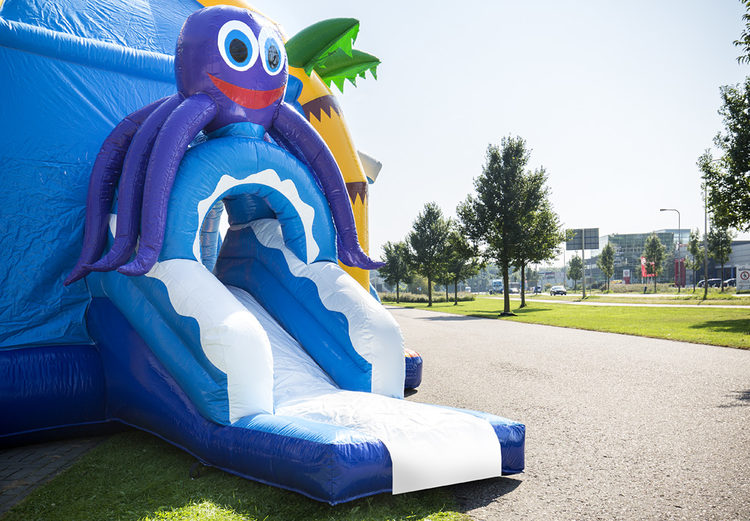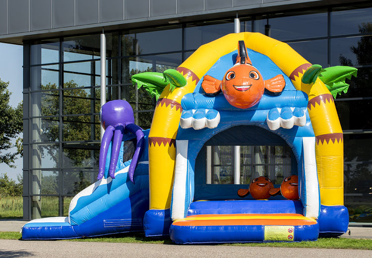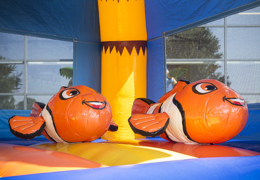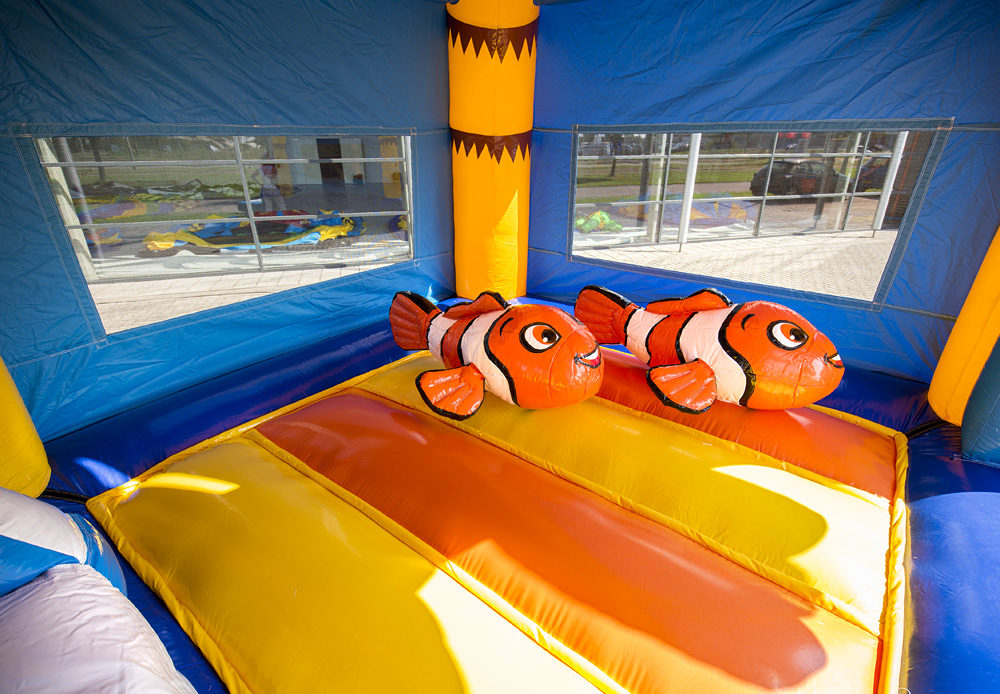 Nadat de kinderen eerst flink gesprongen hebben op het overdekte springkasteel en met de 2 clownvissen aan de binnenkant van het springkasteel gespeeld hebben, glijden ze via de glijbaan aan de zijkant en onder de octopus weer naar buiten. En dit keer op keer opnieuw. Kinderen kunnen er geen genoeg van krijgen. De felle kleuren en leuke figuren in clownvis thema maken er een compleet feest van.