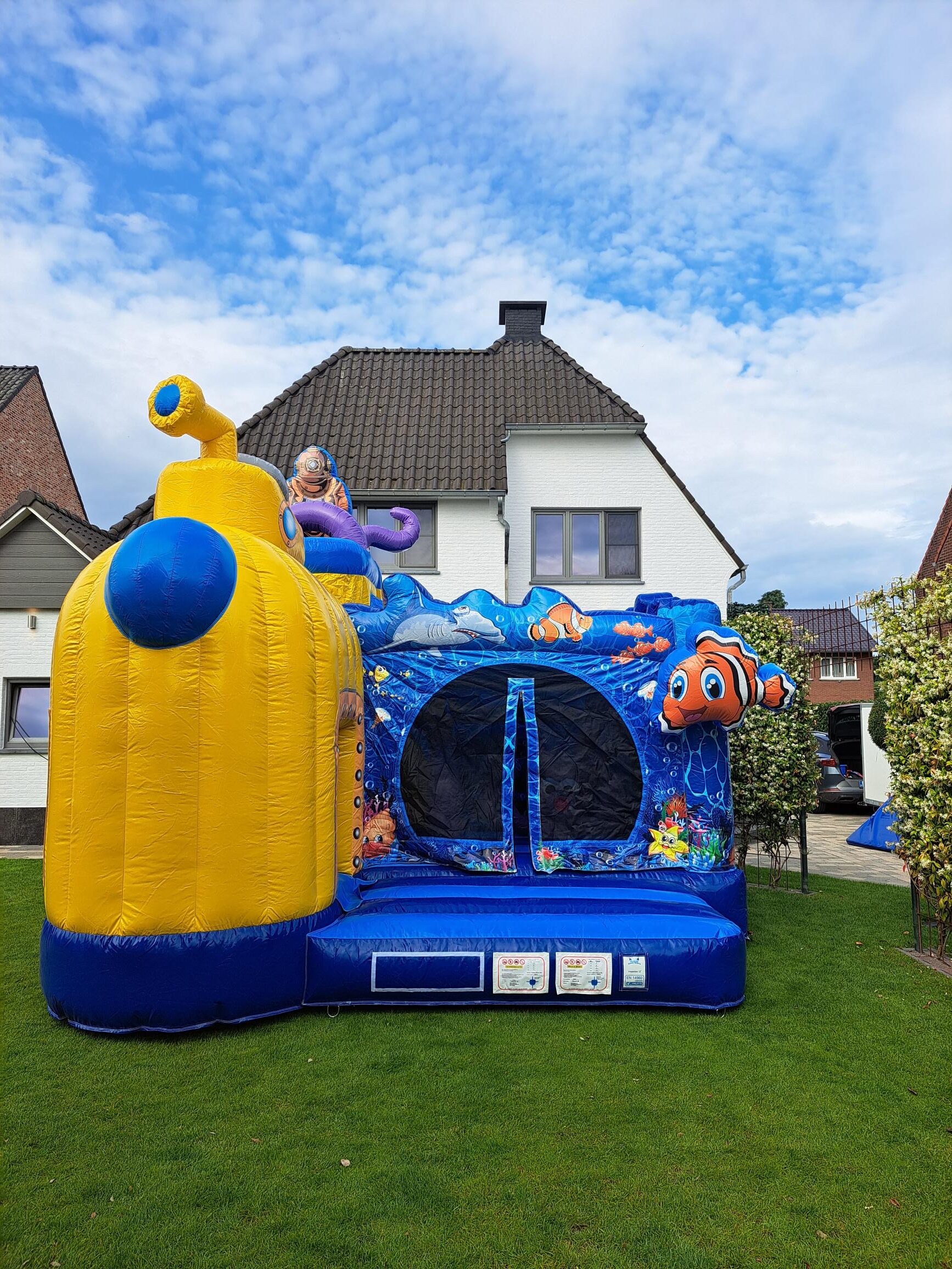 Betreed het Multiplay Yellow Submarine springkasteel en maak een onvergetelijke duik onderwater. Klim op de ladder en glijd keer op keer van de glijbaan af. Durf jij de sprong in het diepe te wagen en kennis te maken met Harry de octopus?